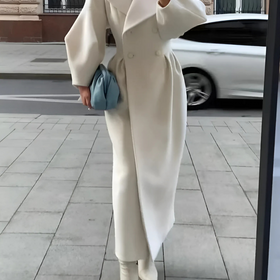 This long coat for women blends architectural elegance with a distinctly modern look. Featuring strong shoulders, voluminous sleeves, and a cross-over cut, it delivers a striking silhouette for those who appreciate comfort with style.