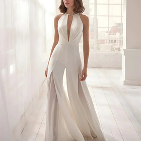 The plunging neckline draws attention to the upper frame, while the fluid wide-leg design features layered slit detailing that adds movement and charm. A defined waist balances the proportions, giving the ensemble a clean, elongated look suitable for dressy occasions.