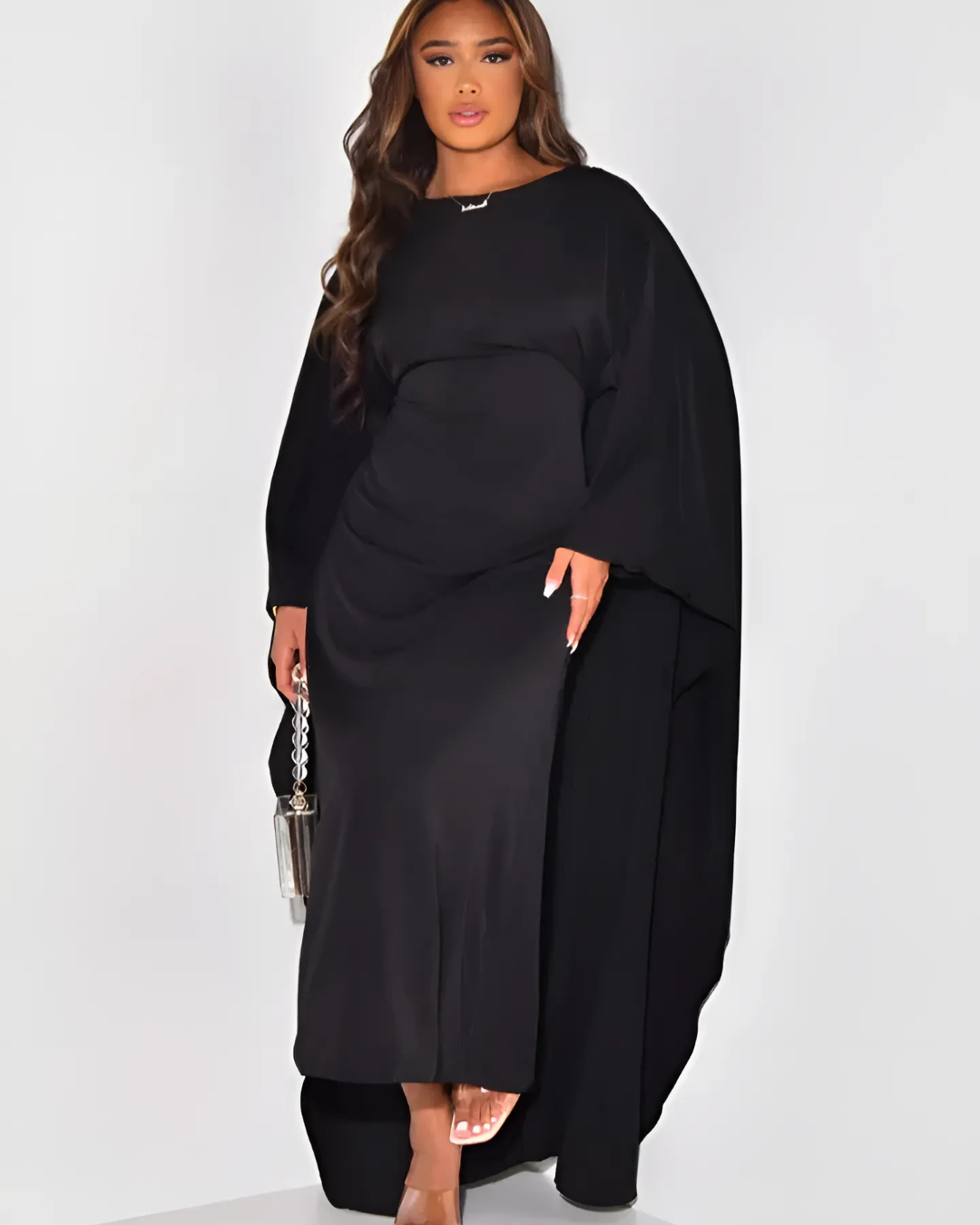 This maxi dress embodies contemporary elegance, perfect for formal events or special occasions. Its flowing cut and draped sleeves add a sophisticated touch, creating a look that is both graceful and modern.