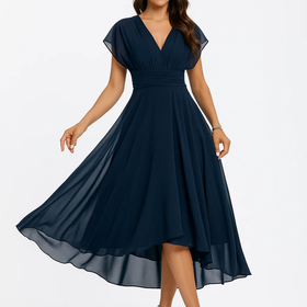 This dress features a gently flared skirt that delivers graceful movement, while the defined waist gently accentuates your figure without constriction. The V-neckline adds feminine allure, and the cut combines elegance with a modern twist, making it perfect for both formal and semi-formal events.