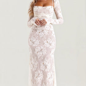 This women’s dress with lace pattern and long sleeves features a slim, floor-length silhouette. The design is suitable for various special occasions and ensures a polished appearance.