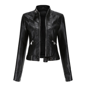 This women's leather jacket features a high stand collar with goose tab, front zipper closure, and belt detail for a structured silhouette. With its slim fit and zippered pockets, it is a striking choice for casual or night wear. An essential piece for modern women's outerwear.