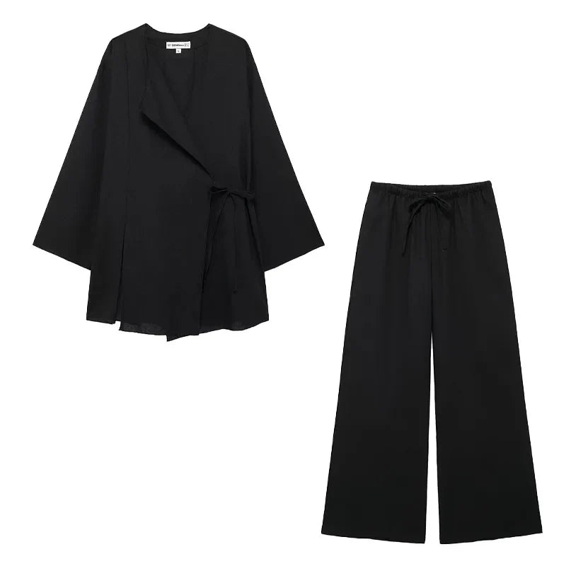 Discover the elegant women's linen suit that combines comfort and style. This set consists of a fashionable brown kimono top and casual, wide-cut pants, ideal for various occasions.