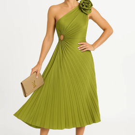 The asymmetrical neckline features a sculptural floral detail at the shoulder, adding dimension and style. A subtle side cut-out draws the waist inward for a flattering fit, while the fully pleated midi skirt flows beautifully with every step, enhancing movement and grace.