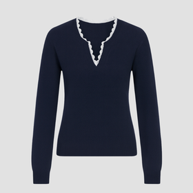- V-neck with scalloped edge: Gives the sweater a distinctive character