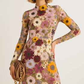 Command attention with this striking floral mini dress, perfect for occasions that call for a bold yet elegant statement. The dress features an illusion-style base adorned with intricately embroidered multicoloured blooms, creating a captivating garden effect from neckline to hem.