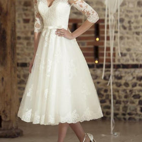 This women's wedding dress has a midi length with a V-neckline and long sleeves. It is adorned with lace and creates a structured style suitable for both ceremonies and receptions.