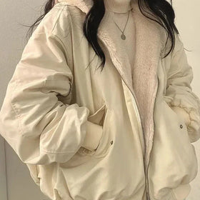 The women's winter bomber jacket has a loose, oversized cut, a light lining, and a zipper. It was designed for layering and combines practical use with modern style, making it suitable for everyday winter looks.