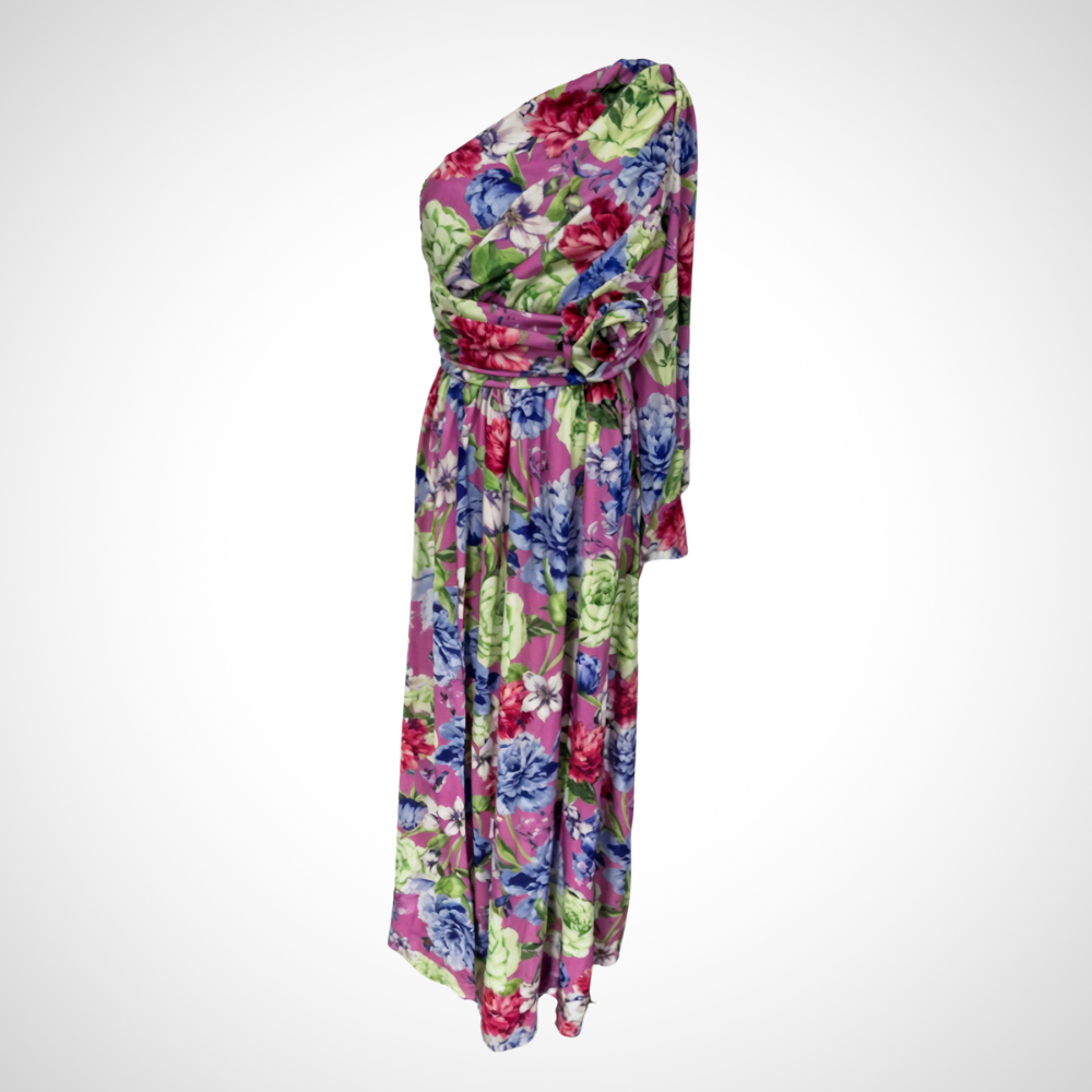 This asymmetrical long dress subtly reveals the shoulder in a stylish way. Its flowing hem and lightweight fabric ensure ideal comfort, even in hot weather. Perfect for an elegant and bold summer look.